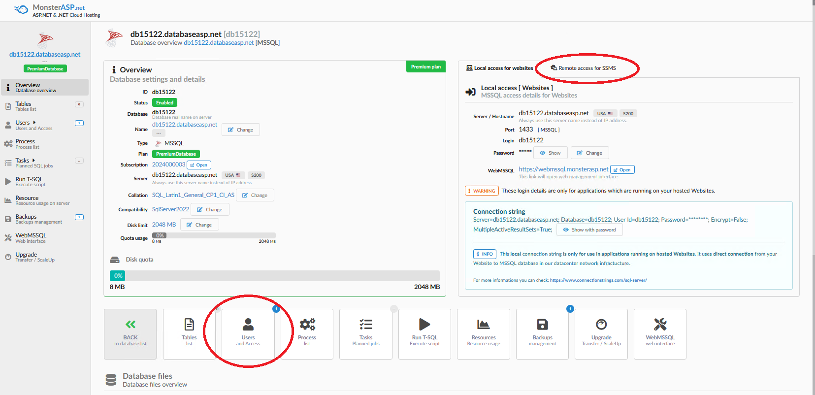 Here you can activate Remote Access for database. By default, after creating the database, is remote access to database DISABLED. To activate, click the Enabled button.
